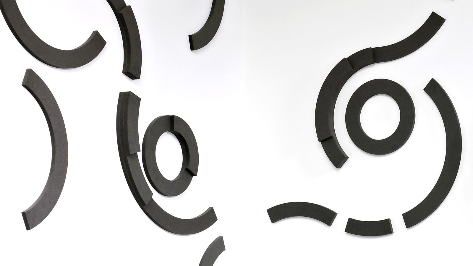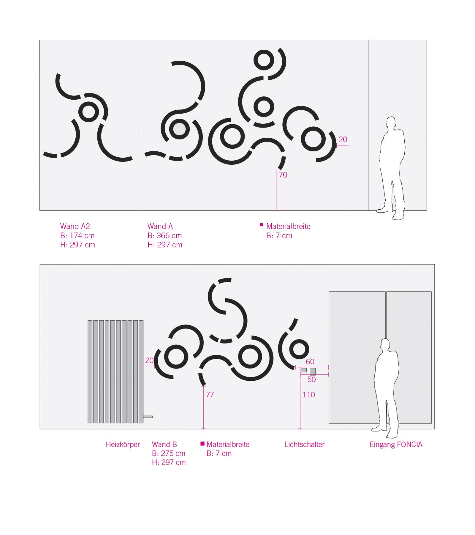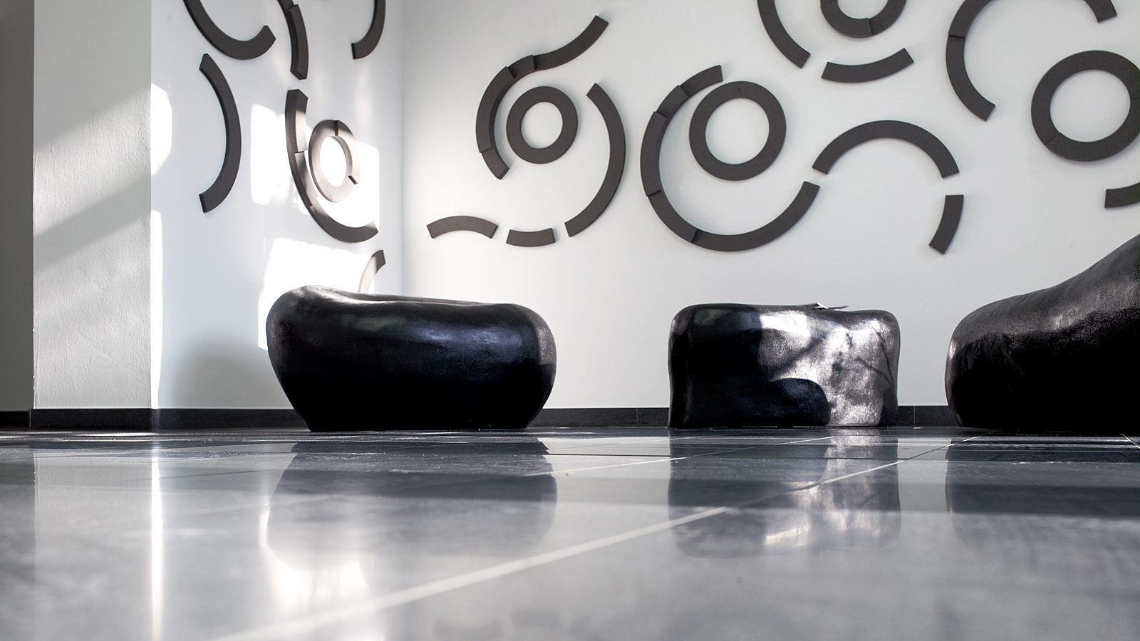Einen Raum verstehen heißt, seine Proportionen erfassen: Form, Format, Funktion, Material und seine Perspektiven. Einen Raum gestalten bedeutet, seine Möglichkeiten zu entwickeln und seine emotionale Qualität zu entfalten. Die zwei- bis dreischichtige Wandinstallation CIRCLE MOVE zeigt offene, kreisrunde Bewegungen, die sowohl Raum als auch Betrachter mitnehmen und willkommen heißen. Die daraus entstehenden Verläufe an mehreren Wänden werden durch ein Arrangement von japanisch anmutenden Pflanzen unterstützt, die reduziert natürlich die Bewegungen aufnehmen. An überdimensionierte Kieselsteine erinnernde Sitzmöbel aus gegossenem Beton untermalen diese kreierte Lebendigkeit und signalisieren eine offene Kommunikationskultur.