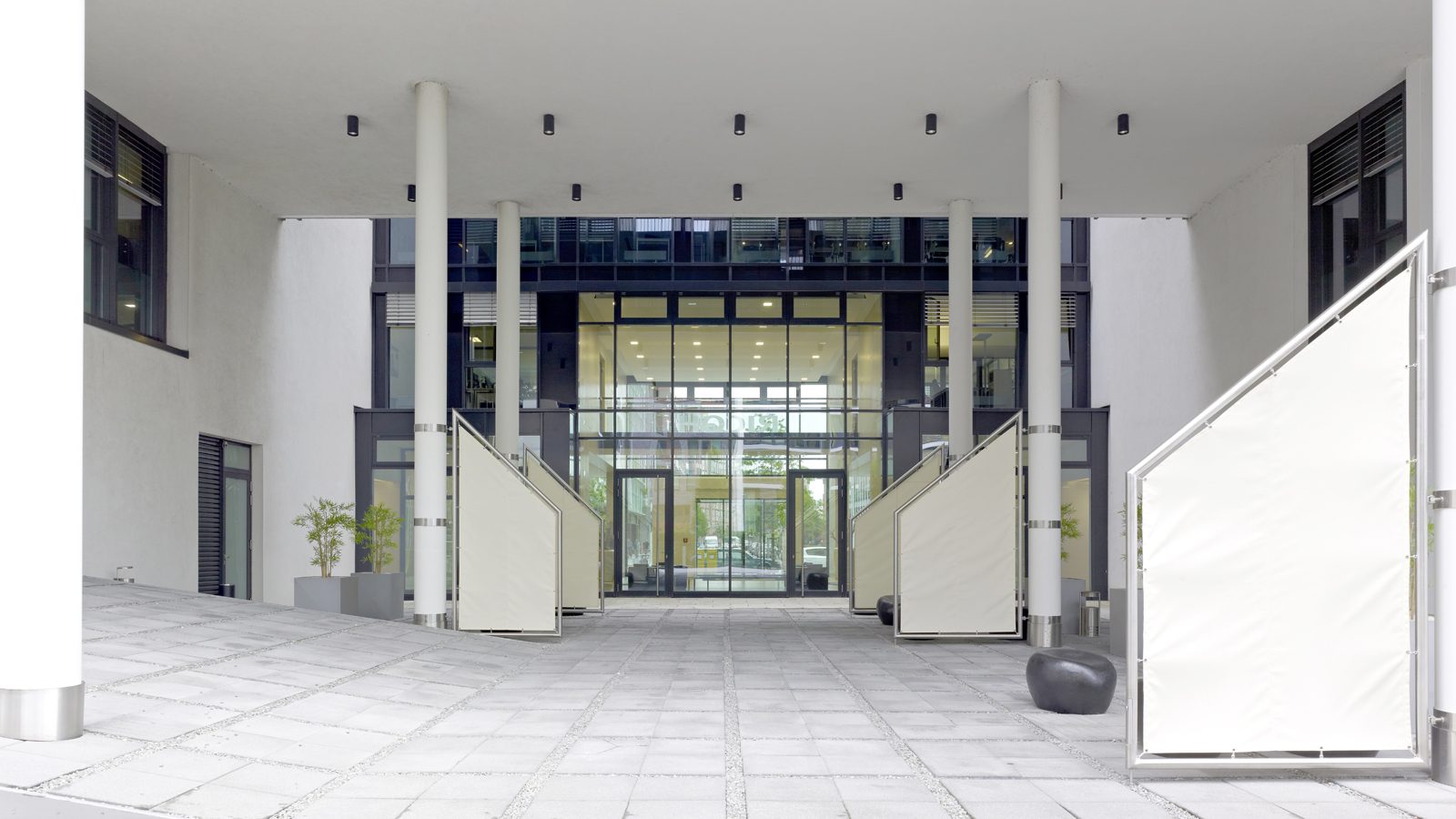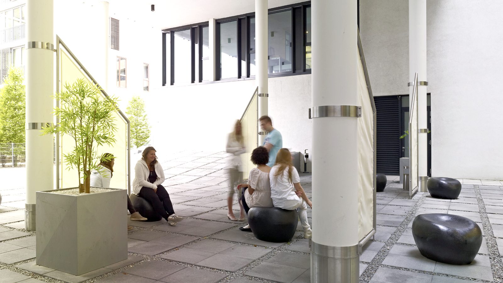 Segel setzen. Maritimes Flair zur Förderung von Kommunikation und Austausch. In den Außenbereichen wurden Segel gesetzt, die als Windschutz dienen, der bei der Hafenlage des K1 unvermeidlich ist. So entstanden Ruheinseln mit speziell gefertigten Sitzobjekten, die wie vom Wasser glatt gespülte Felsformationen wirken und Mitarbeiter und Gäste zu entspannten Pausengesprächen einladen.