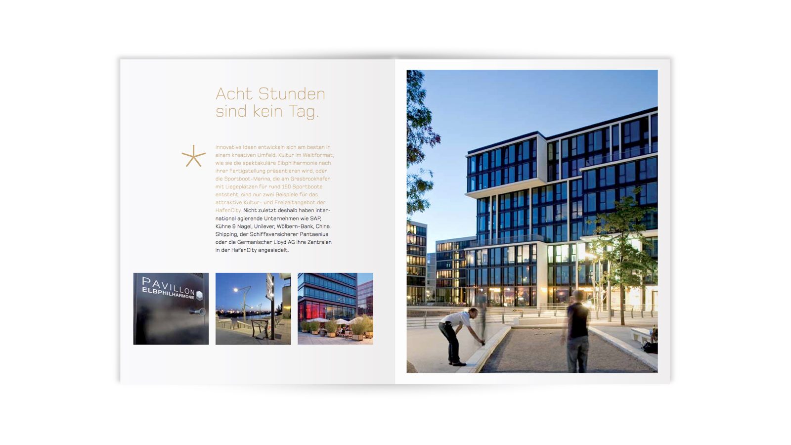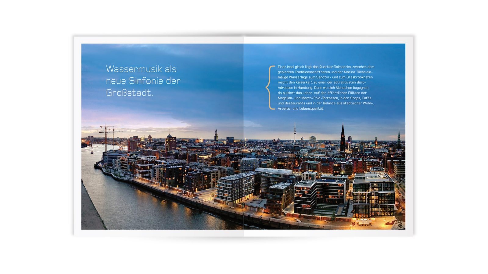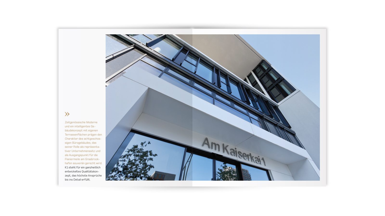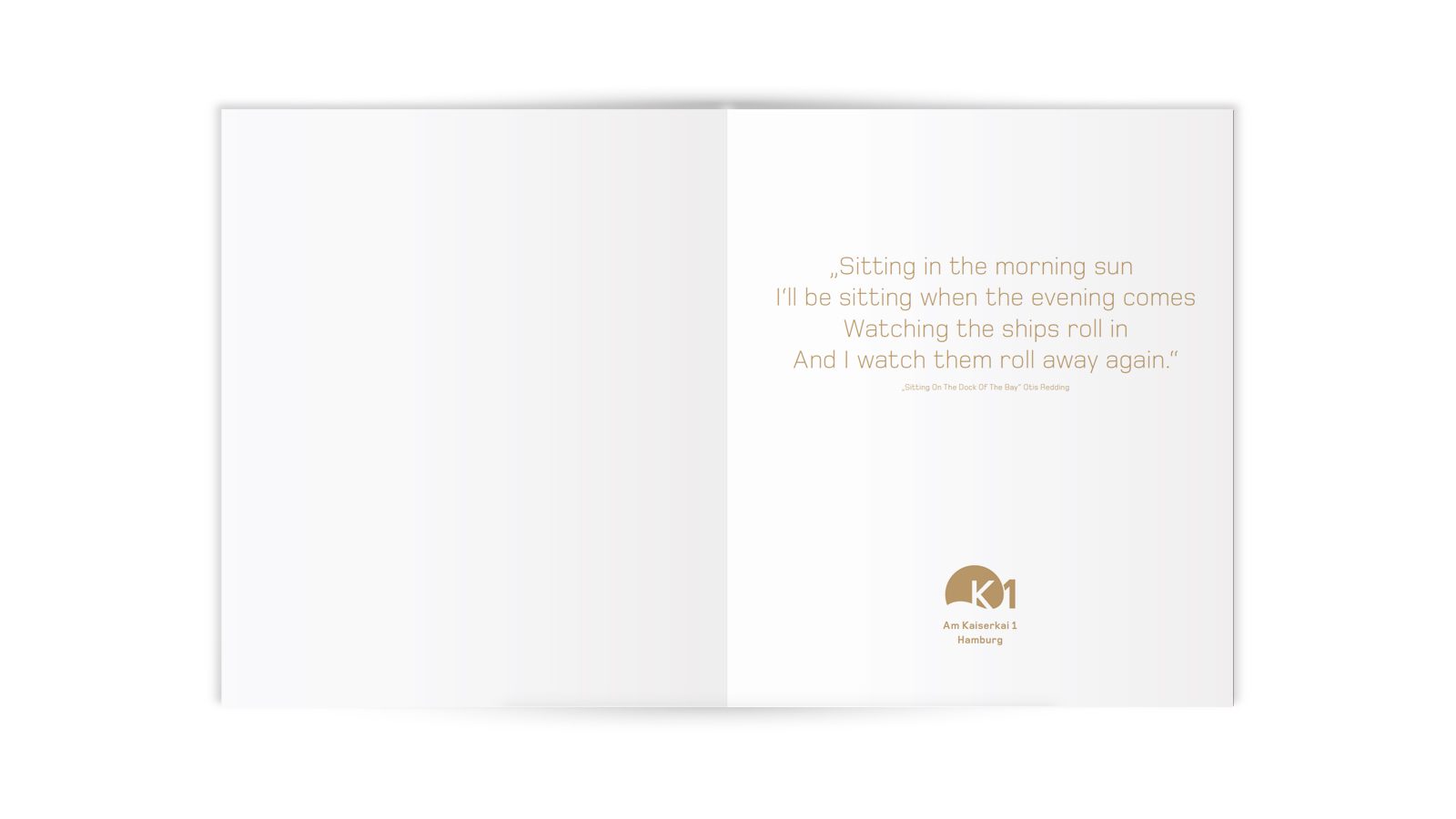 Eine Vermarktungskampagne der musikalischen Art für das Projekt K1: Durch die Titelheadline „Sitting On the Dock of The Bay“ gelang es scs schaafhausen, den Betrachter akustisch anzusprechen – bereits beim Lesen der Headline setzt die Melodie im Kopf des Lesers ein und nimmt ihn auf eine musikalische Reise durch die Immobilie bzw. die Imagebroschüre mit. Die Namens- und Logoentwicklung sowie die Imagebroschüre und die Website wurden entsprechend diesem Gedanken konzipiert. Das Logo, mit dem man sowohl Wasser als auch Sunset assoziiert, verortet das Bürohaus – ebenso wie der Soundtrack – in der Hamburger Hafencity.