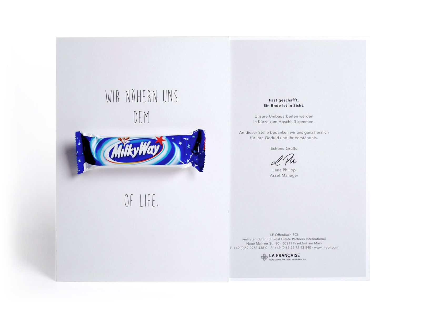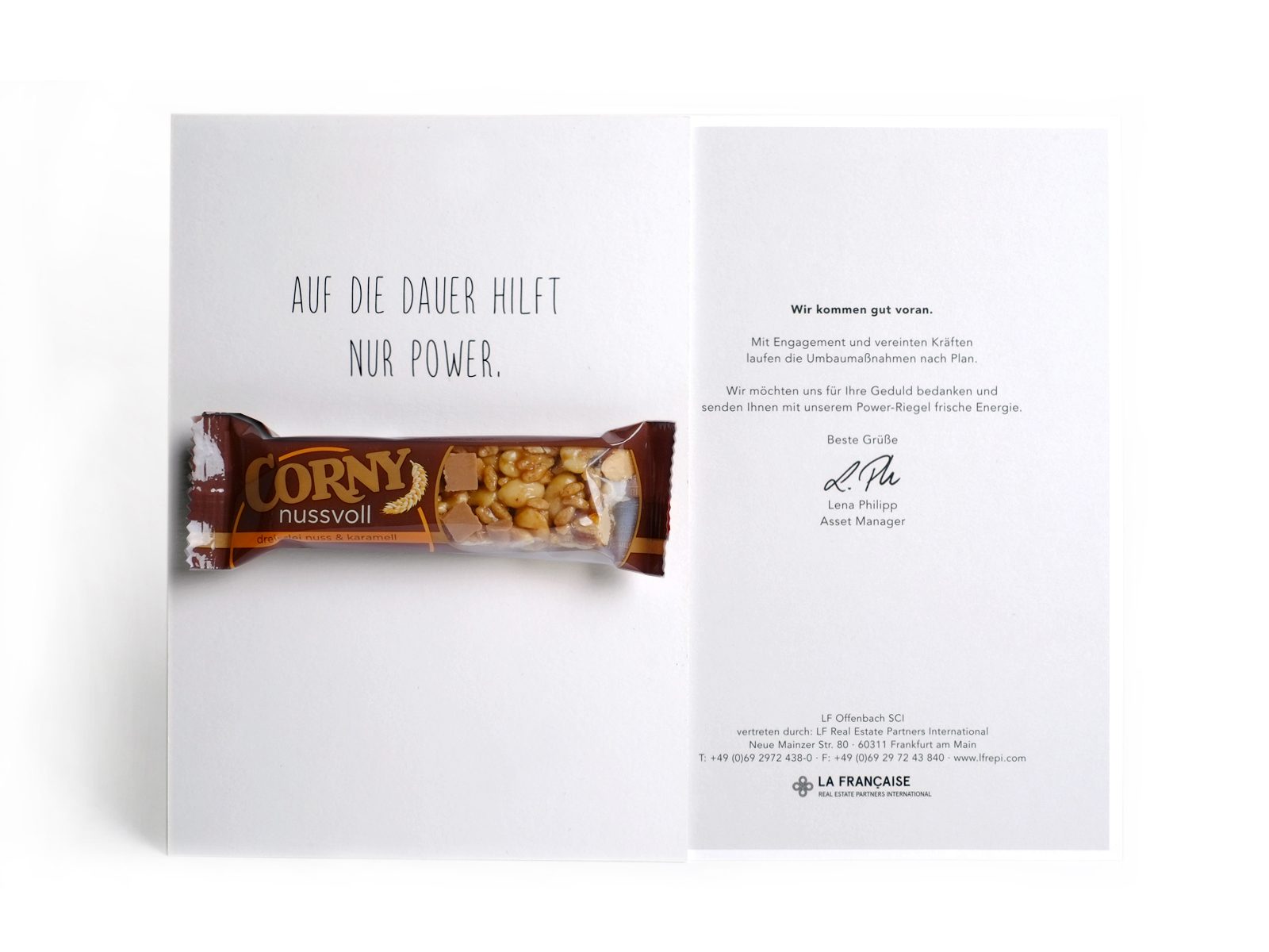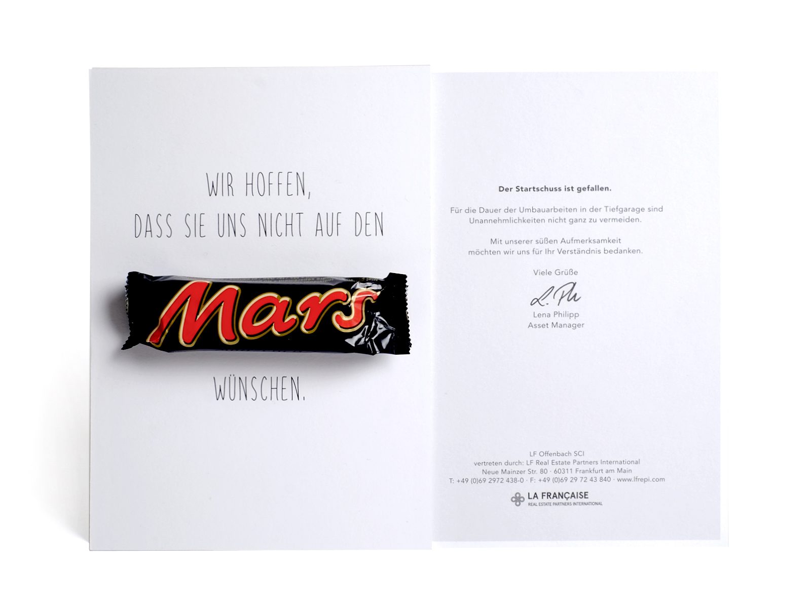 Daß eine Tiefgaragensanierung über mehrere Monate hinweg viel Lärm, Schmutz und blankliegende Nerven bedeuten kann, war der Eigentümerin des Gebäudes von Anfang an bewusst. Diesem Bewusstsein Ausdruck zu verleihen, war die Aufgabe von scs schaafhausen. In regelmäßigen Abständen wurden die Mieter und deren Mitarbeiter mit informativen wie humorvollen, süßen Grüßen überrascht. Wir freuen uns mit der Eigentümerin über den erfolgreichen Ablauf aller Maßnahmen und die weiterhin gute Stimmung unter den Mietern.