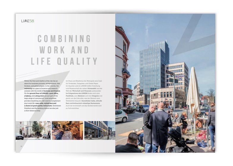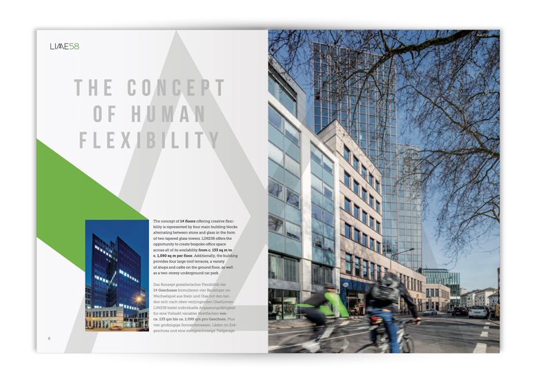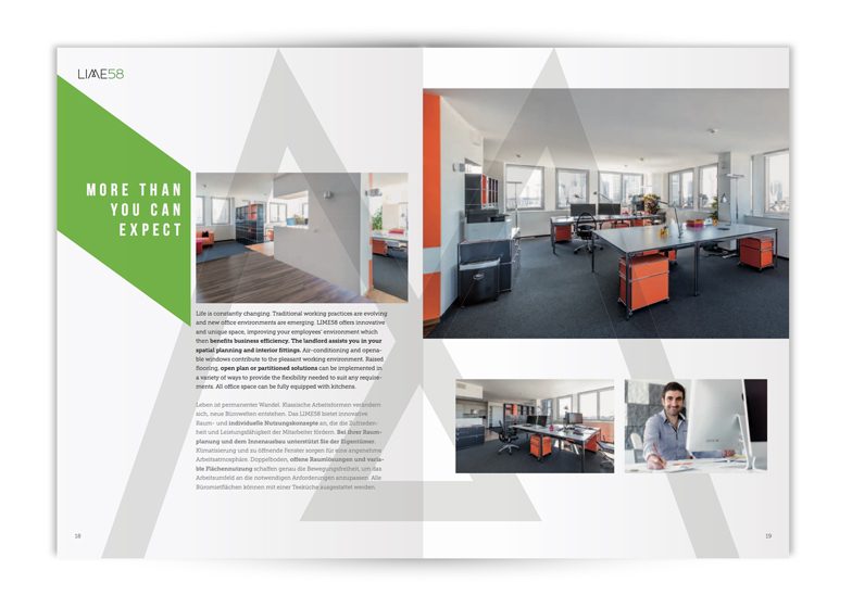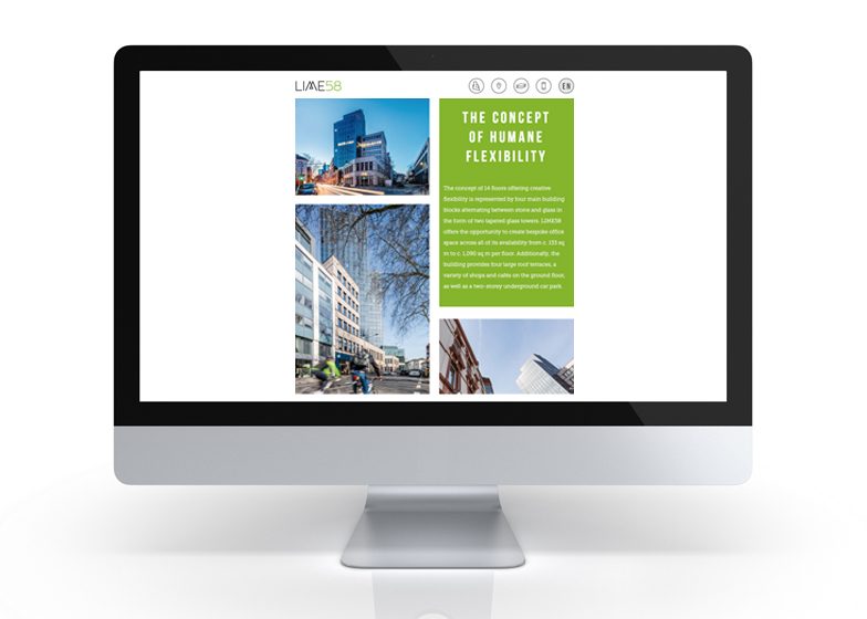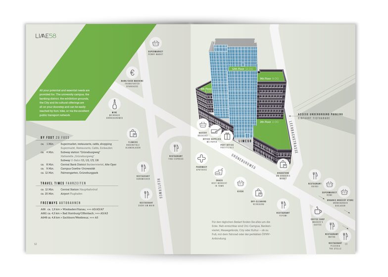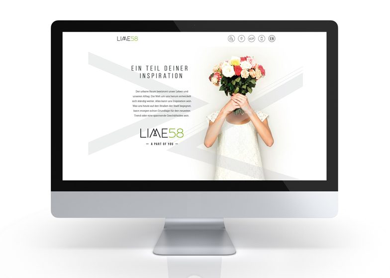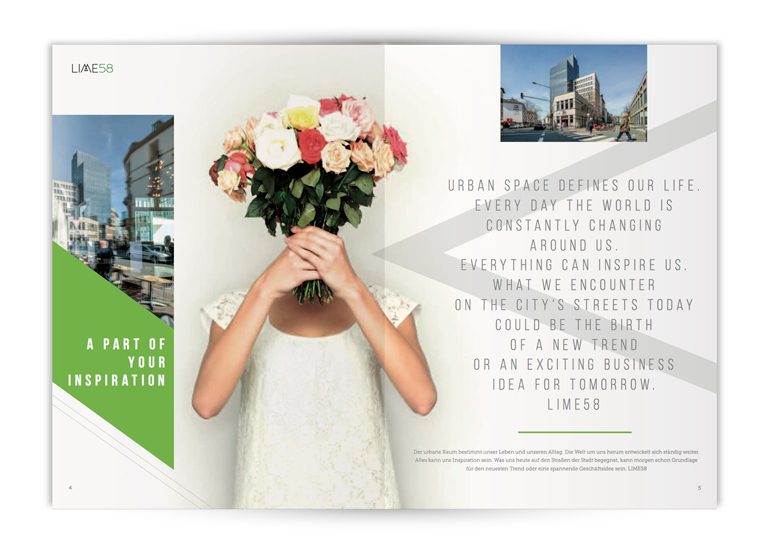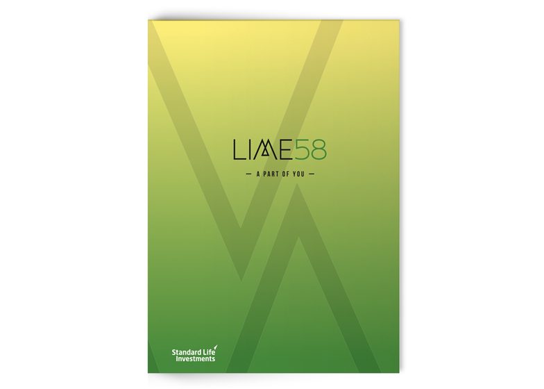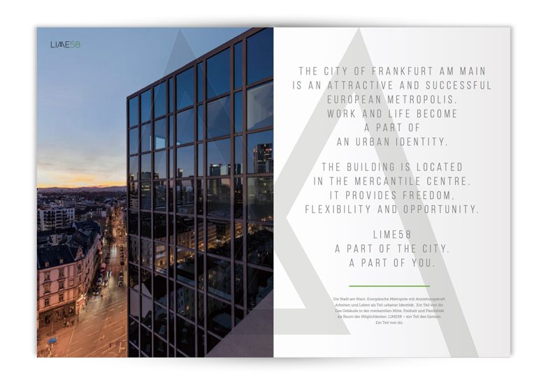 Die Farbe Grün sowie der Standort im Grüneburgweg zwischen zwei urbanen, aber unterschiedlichen Distrikten, bildeten für scs schaafhausen die Basis für Namensfindung und Logo. LIME58 lehnt an die Bedeutungen von „Limes“ (Burg, Grenzwall, Schneise) an und nimmt mit der Bedeutung des englischen Wortes „lime“ das Grün des Straßennamens auf. Der Claim „A part of you“ unterstreicht das urbane und inspirierende Umfeld des Stadtteils. Das modifizierte „M“ im Logo symbolisiert den Standort als Schnittstelle und Bindeglied zweier urbaner Bereiche und wurde zum gestalterischen Element aller Vermarktungsaktivitäten wie Banner, Broschüre und Website.
