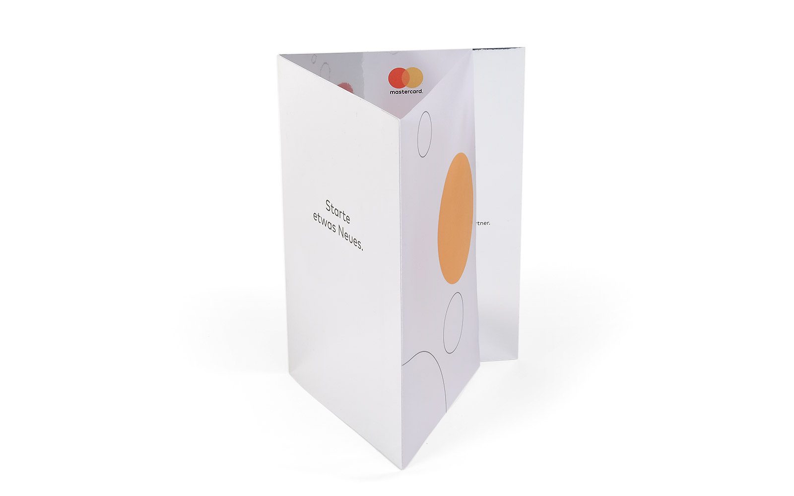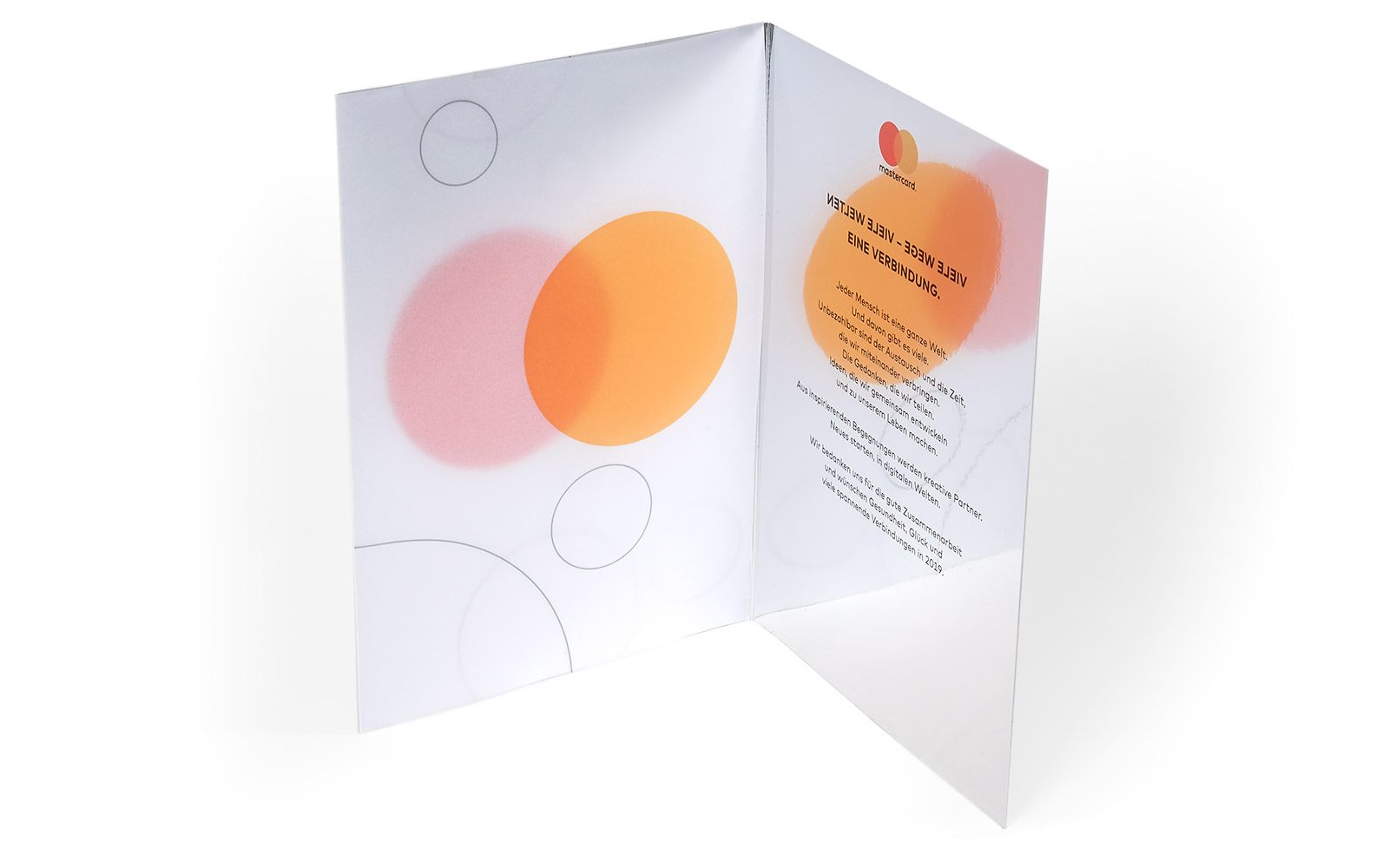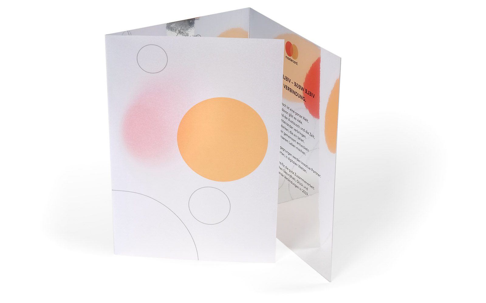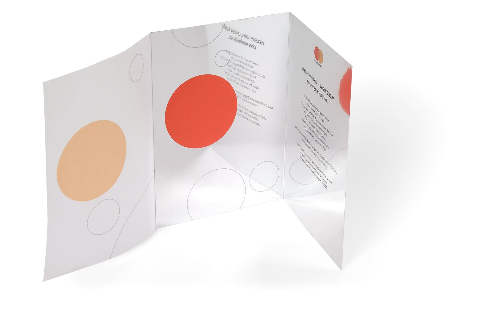 Etwas neues Neues starten, das fängt mit uns selbst an. Die Titelseite in Spiegelfolie begrüßt mit dem MASTERCARD-Claim den Betrachter und untermauert die Aussage. Beim Blättern wird über das Transparentpapier das Logo mit seiner Farbmischung Rot und Orange verdeutlicht und damit eine weitere Visualisierung des MASTERCARD-Erscheinungsbildes erzielt.
