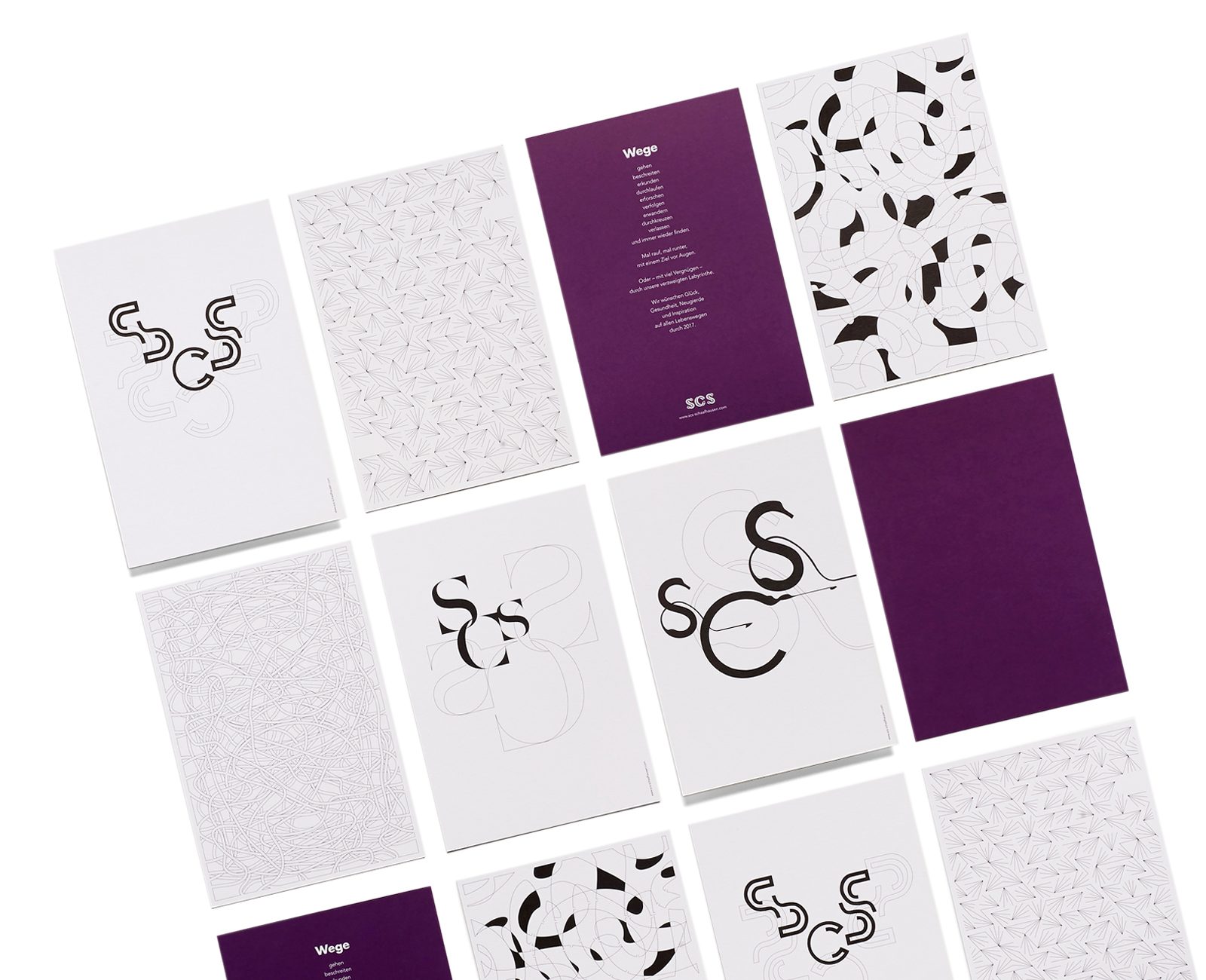 Wege gehen – beschreiten – erkunden – durchlaufen – erforschen – verfolgen – erwandern – durchkreuzen – verlassen – und immer wieder finden. So beschreibt die Aussendung, bestehend aus drei mit einem farbigen Gummi fixierten Karten Lebenswege, die manchmal ebenso nicht stringent verlaufen wie in den drei entwickelten grafischen Labyrinthen. Mit Bleistift und viel Spaß konnte sich der Empfänger auf seine ganz persönliche Suche nach dem Ziel machen.