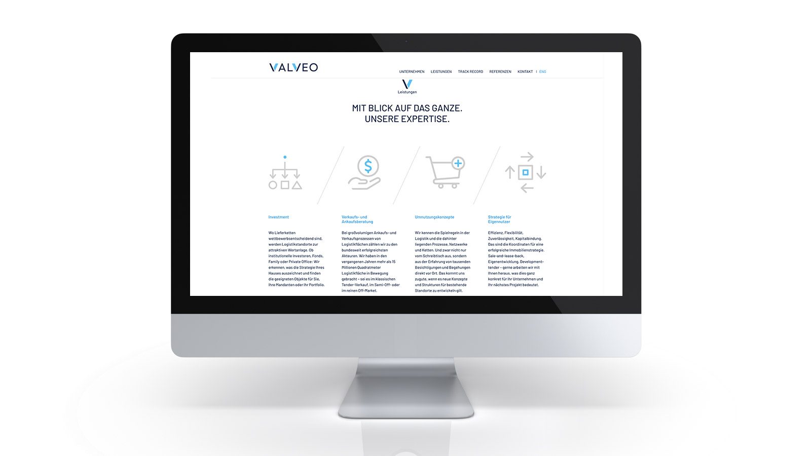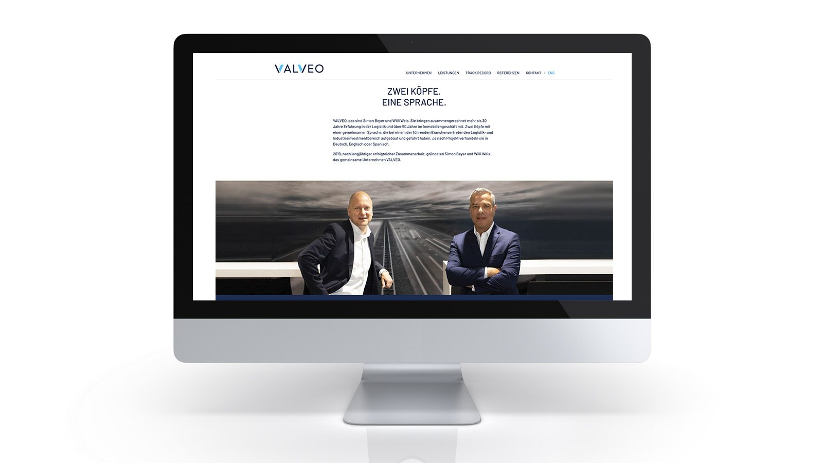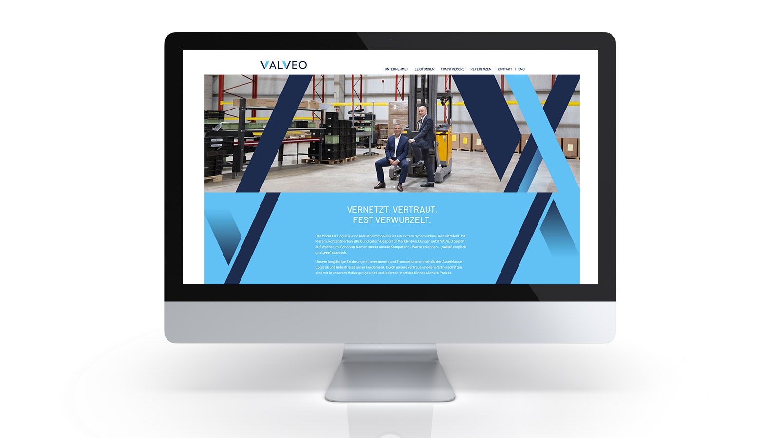 Verwurzelt und geerdet sind die Begriffe, die mit VALVEO, das sind Simon Beyer und Willi Weis, in Verbindung gebracht werden. Mit klarem, konzentrierten Blick und gutem Gespür für Logistik- und Industrieimmobilien treten sie mit einer gemeinsamen Sprache und einem langjährig eingespielten Führungsstil auf. Das Corporate Identity und die Anwendungen bauen auf die Farbe des Vertrauens – Blau – sowie auf Konzentration und Beweglichkeit der Macher auf.