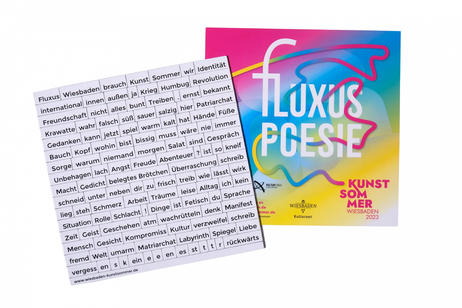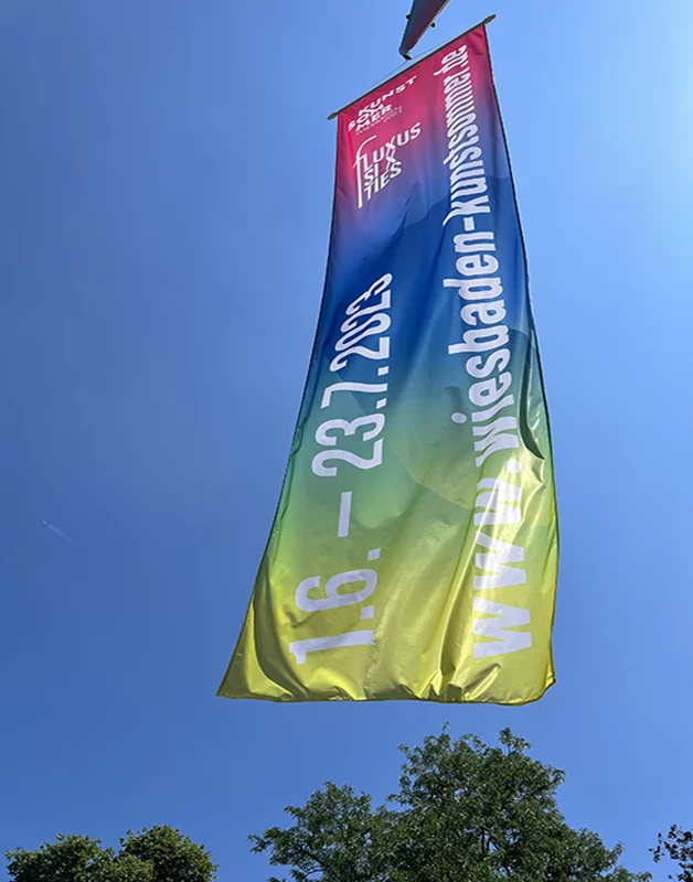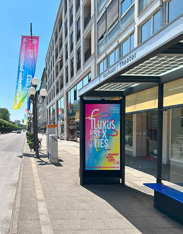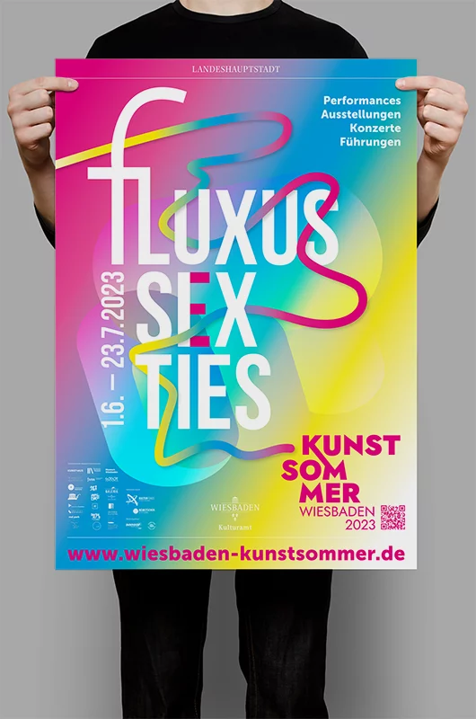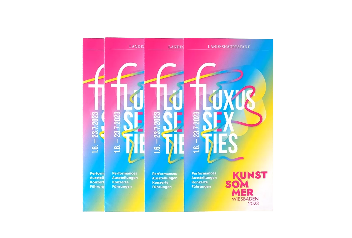 Der Wiesbadener Kunstsommer 2023, unter dem Thema FLUXUS S(I)EX TIES, brachte die zeitgenössische Kunstströmung Fluxus aus den 60iger Jahren in unseren heutigen Kontext. Stadtübergreifend und interdisziplinär lud das vielfältige Kunstsommer-Programm zum Austausch und Perspektivwechsel ein. Plakate, Anzeigen, Fahnen mit dem farbenfrohen Erscheinungsbild spiegelten die Sommerstimmung wider.