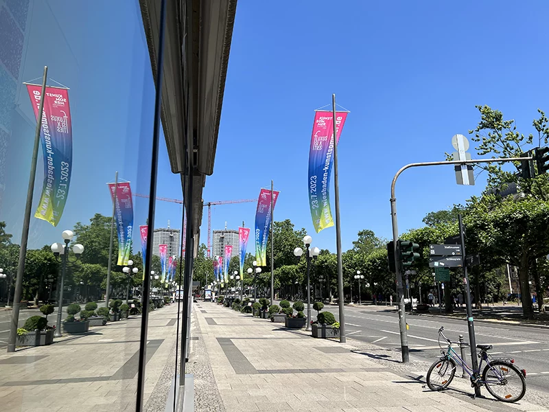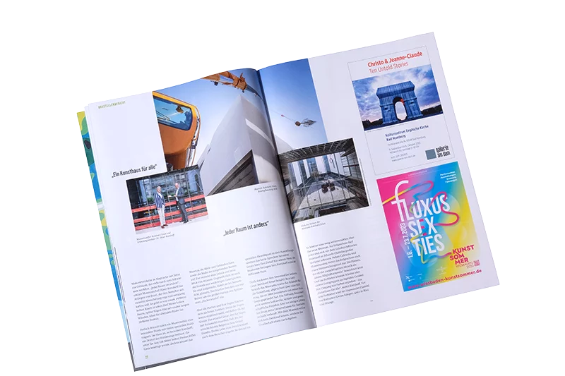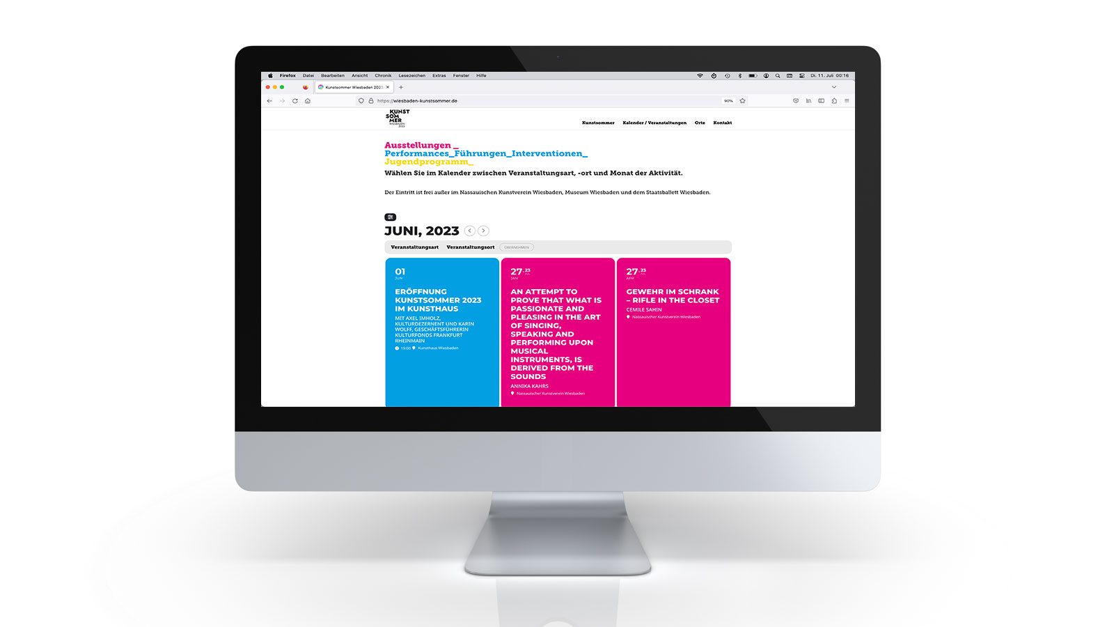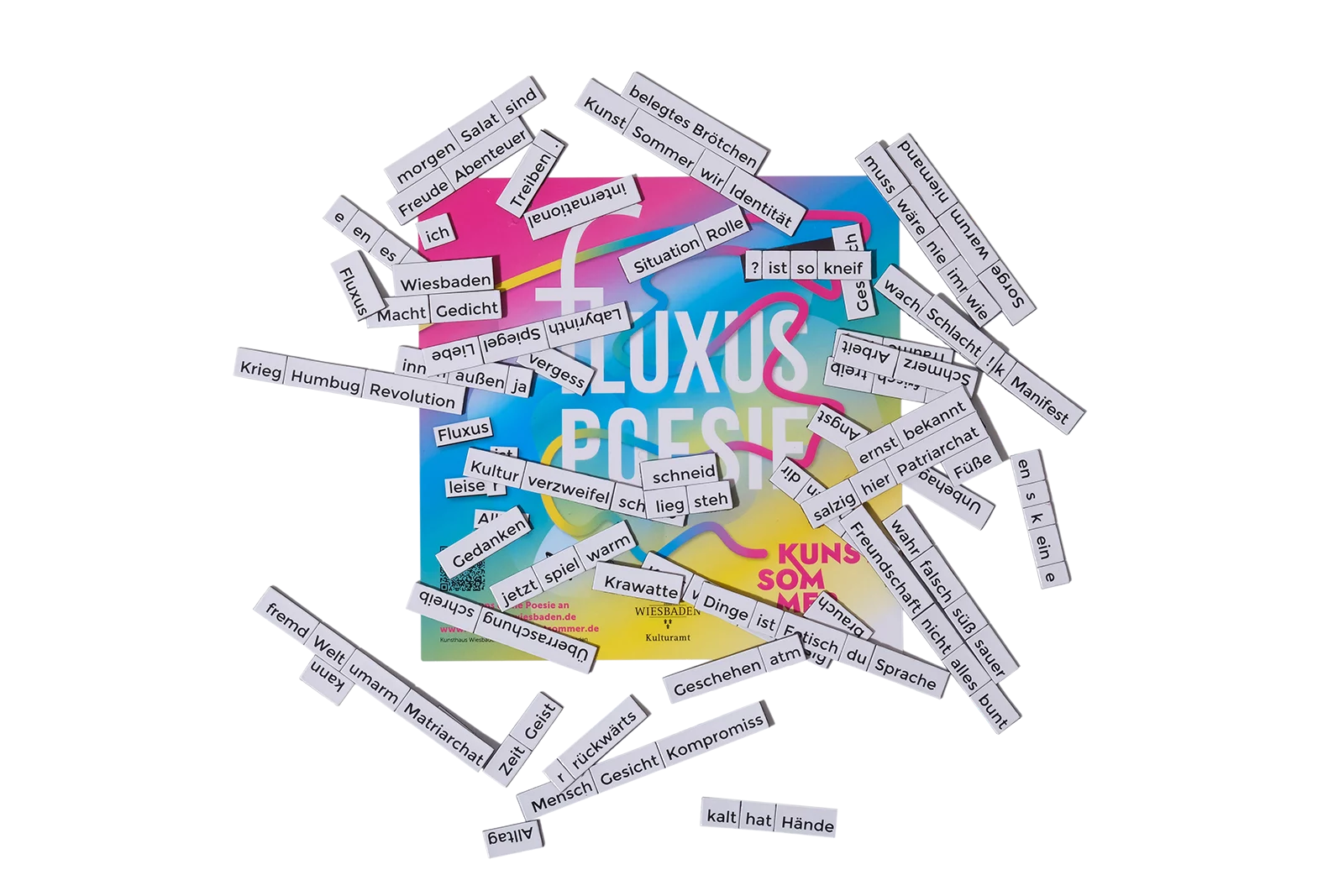 Der Wiesbadener Kunstsommer 2023, unter dem Thema FLUXUS S(I)EX TIES, brachte die zeitgenössische Kunstströmung Fluxus aus den 60iger Jahren in unseren heutigen Kontext. Stadtübergreifend und interdisziplinär lud das vielfältige Kunstsommer-Programm zum Austausch und Perspektivwechsel ein. Plakate, Anzeigen, Fahnen mit dem farbenfrohen Erscheinungsbild spiegelten die Sommerstimmung wider.